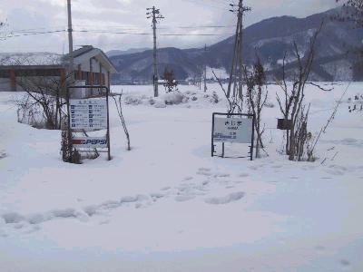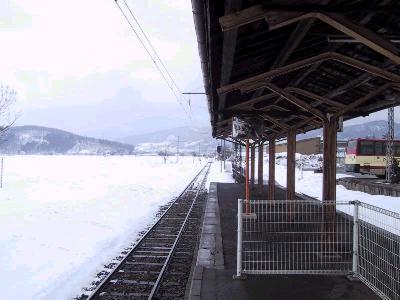 | この日は昨日と打って変わって雪模様 信州中野駅 | 木島行の車内。ワンマン運転のため、 後ろの車両には誰も乗っていない。 このような光景を見せ付けられると、廃止を納得せざるをえない。 |