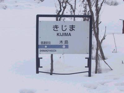 | 木島駅 駅名標 場所を移動したのか、信濃安田駅が反対側になっている。 |