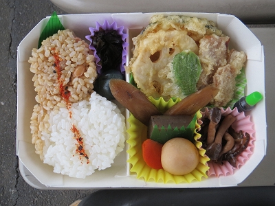 | 宇都宮駅弁 芭蕉気分 500円 | 500円と格安な割には掛け紙もあり、中身も瓢箪型の2色のご飯に てんぷらなどおかずも充実しています。 |