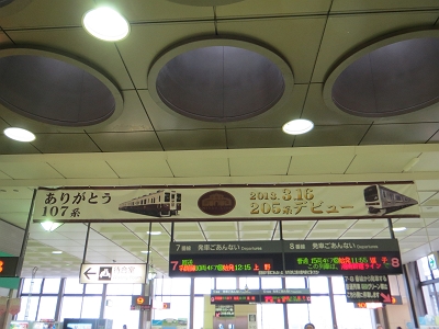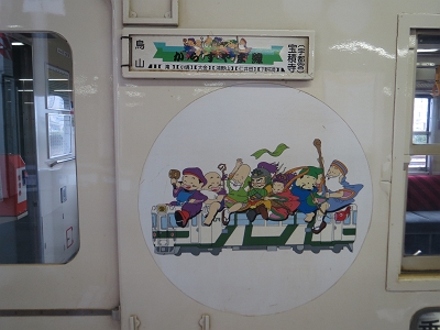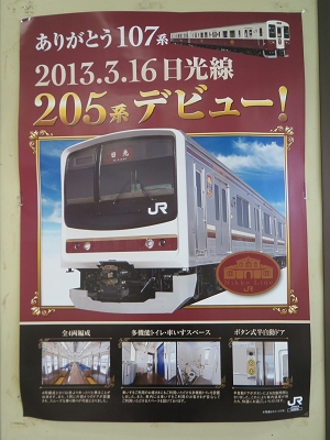 2台目にやってきたのが、日光線仕様の205系。ちゃんとヘッドマークもついていて、安心しました。このヘッドマークはダイヤ改正の3月16日〜今日3月31日までの予定である。なんとかすべりこみで写真を撮ることができました。各車両には日光駅の駅舎をはじめ、中禅寺湖や華厳の滝など日光の名所が描かれたステッカーが貼られている。