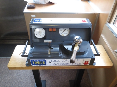 | 車内の様子 | 子供用の模擬運転台があります。 ブレーキハンドルは本物のようです。 |