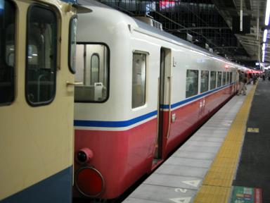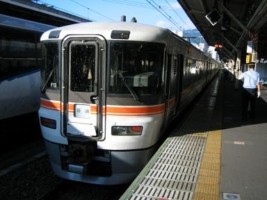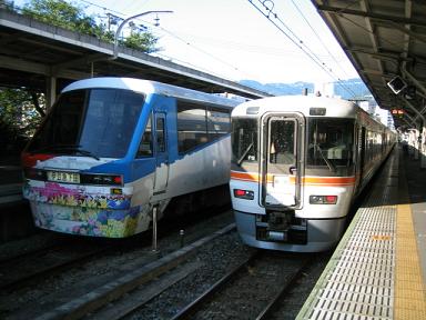 373はいつもどおりの乗車率といった感じで、比較的好きなところに腰掛けられる。海側をとるか山側をとるか、いつもは海側に座るがたまには富士山を見ながらいくのもいいなっと思って山側に座る。多摩川を越え、神奈川県に入り、横浜を過ぎる頃には、朝早く起きたことがたたり、早速一寝入りする。次に起きたのは曇り空の中の真鶴付近。ってことはせっかく山側に座ったのに、富士山は見えないってわけだ。(笑)。熱海では毎回恒例の写真撮影。今回はまもなく引退が噂される伊豆急リゾート21との2ショット。丹那トンネルを抜けて、JR東海管内の函南へ。沼津を過ぎた辺りで再び眠りに付き、気がつくと東静岡。静岡では2分接続でホームの反対側への211系浜松行に乗り換える。373系から比べると味気ないが、最近は、ロングシートで東海道線を下るのにもだいぶ抵抗がなくなった。豊橋からは新快速に乗り換えて名古屋を目指す。相変わらず4両編成の313系は満員状態だが、向かい合わせになった4人席になんとか座らせて貰う。18きっぷの時期しか乗らないので、普段はよく分からないが、名古屋圏の新快速はやっぱり4両ではちょっと短い感じがする。少なくても6 両編成にはして欲しいところだ。