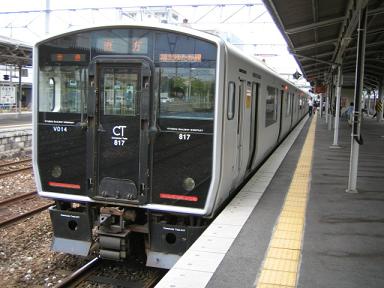さて、車販も何もない車内に閉じ込められて、お腹もすいてきたので、早速博多でめんたい弁当を購入。福北ゆたか線に乗り込む。817系は普通列車では破格の本皮シートを使用した贅沢な車両。前面のブラックフェイスはかつて炭鉱だった筑豊地区を通るとのことで石炭の黒を表している。