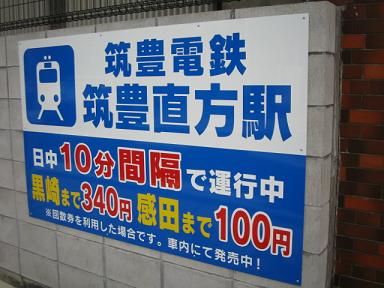 直方からは、久しぶりに筑豊電鉄に乗るため、ここで下車。筑豊電鉄の直方駅は、JRの直方駅とは徒歩7、8分離れていて、乗換にはかなり不便だが、道は途中一回だけ、広い道を1回左に曲がるだけなので、比較的分かりやすい。JR改札口を出たところに、周辺地図があるので、乗り継ぐ人はざっと確認しておくとよいだろう。近道は駅前の広い道ではなく、左側の細い道を斜めに入って行き、郵便局に突き当たったら左へ曲がると比較的早い。筑豊電鉄の駅は高架駅で、道路のところでその高架がぷつっと途切れている。路面タイプの電車なので、高架駅にはいささか不釣合いな感じがする。そして惜しむらくは、路面タイプなので、逆に地平にしておき、JR直方まで併用軌道で接続すれば便利だったものをと思われてならない。