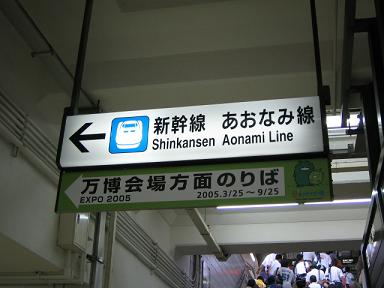 名古屋からは愛知万博期間中だけ走っている快速エキスポシャトルで万博八草へと向かう。ちょうど昼時なので、ホームで「みそかつ・えびふりゃあ」という駅弁を買い求めて列車に乗った。車両は6両編成の211系オールロングシート。平日のこんな昼時から万博へ行くという人は少ないのだろう、比較的車内がすいていたので、ロングシートの中で、駅弁を食べてしまう。昔はロングシートでの駅弁にはかなりの抵抗があったが、慣れとは怖いもので、最近は、混雑してなければ、平気になってしまった。(笑)。ちょうどこの列車は1時間に1本の快速列車で、中央線の高蔵寺まで快速運転を行なう。乗り合わせた乗客の様子を見ると、万博への客半分、地元の利用者半分と言ったところ。千種を出たところで、車掌が乗り越し精算に回ってきたので、18きっぷを提示して、「万博八草までの乗り越し」と言うと、早速若い車掌が端末操作を始めたものの、なかなか発券されない。そして、「すみません、他社線だけの切符は発見できないようです。降りたときにお願いします。」だそうだ。俺は鉄道おたくだから理屈は理解できるし、まあそんなもんかなって思うけど。一般客には納得できないだろ うな。左手に神領の車庫を見ると高蔵寺に到着。