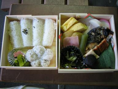 | 京都駅 幕の内お弁当 | 幕の内でも中味は京風の料理が詰まっています。 扇形や花形の御飯や薄口のおかず、はも、生麩等、 京の味満載です。 |