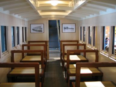 | 明治42年製の客車です。 | 車内の様子 椅子の部分は畳張りになっています。 |