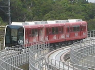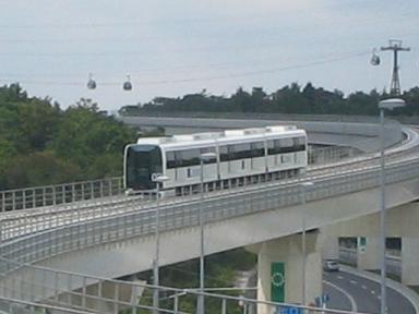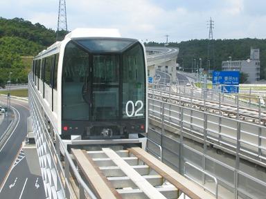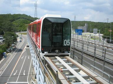 | 全面ガラス張りが特徴です。 | 万博八草を出発するとすぐにS字カーブの急勾配を 登って行きます。奥には万博の長久手会場と瀬戸 会場を結ぶゴンドラも見えています。 |