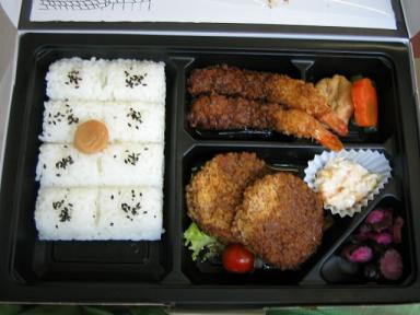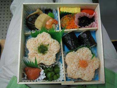 | 博多 めんたい弁当 | 明太子をまぶした梅の形をしたごはんと左下の明太子と 一緒に食べるための白飯ののり巻が入っています。 おかずは福岡ということで当然筑前煮になります。 |