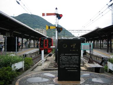 | 関門間を行き来するため交直流車の415系がたむろしています。 | 門司港駅といえばこの0マイルポストです。 |