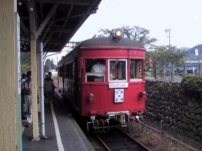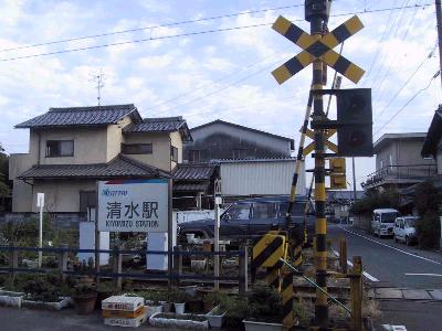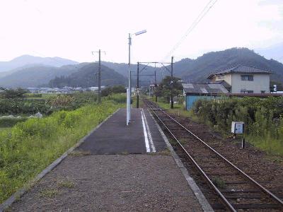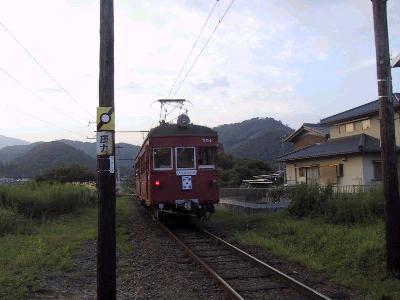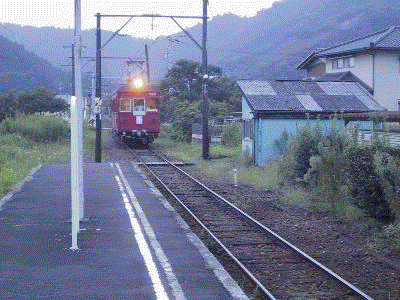 。四度黒野に戻り、本当にこれが最後の揖斐線へ。こちらも、先ほどまでのファンでごった返していた車内は嘘のように静まり返っていた。それでも、数名はファンが乗っていたが...。谷汲線でも、終点の1つ前で降りてみる。本当にローカルって感じの趣ある駅だが、気が付けば、ファンの何名かがホームの外から夕暮れをバックに撮影しており、なんか、私が下車して悪い感じだったので、そそくさとホームを降りたが、特に行くとこもなく、再び1面のホームへ。後には石灰かなにかの採掘で大きく削り取られた山が間近にそびえており、夕暮れとあいまって、一種独特の雰囲気をかもし出している中に、遠くから、踏み切りの鐘が聞こえ出した。電子音ではなく、鐘の音というところがまたいい。