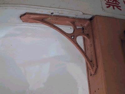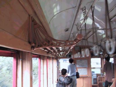 | 天井と柱を支える金具にも唐草のデザインがほどこされている。 | 吊革棒を支える支持も曲線のラインが美しい |