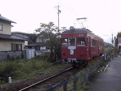 | こちらが、元々あった名鉄新関駅。関とはわずか300mの距離だ。 | 徹明町に停車中の590形 ほとんど安全地帯らしきものはない。 |