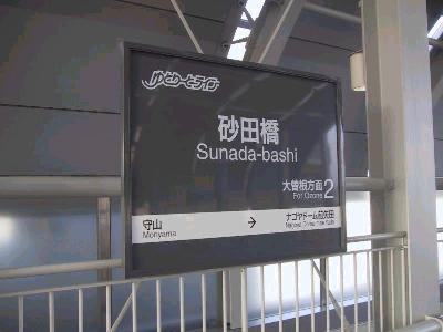 | 砂田橋に到着したゆとりーとライン | 砂田橋の駅名表...でいいんだよね |