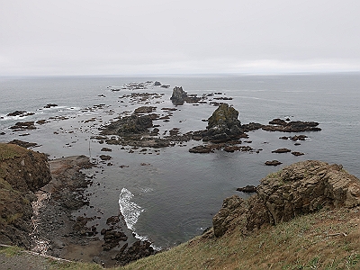 | 岬の先まで岩礁が続いているのが襟裳岬の特徴です。 | 日高山脈から続く尾根がここで海に入っていく様子がよく分かります。 |