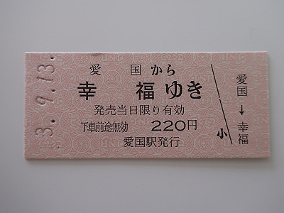 | 後方 | 愛国から幸福ゆき 硬券乗車券 愛国駅そばの土産物店で販売しています。 |
