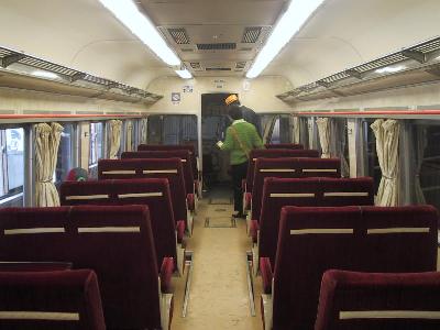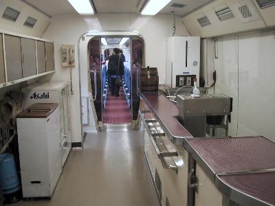 | 10000系の車内。連接車のため1両が短いです。 | 走る喫茶店のキッチンです。 |