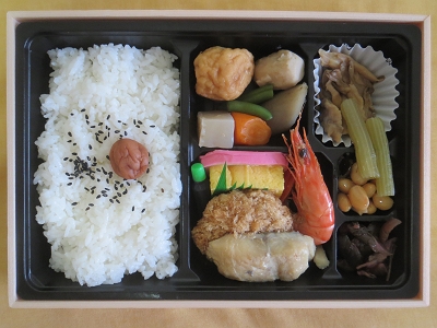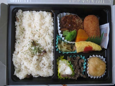 | 横須賀線E217系 | 一口カツ、えび、鰆の西京漬けの入った和食の弁当です。 |