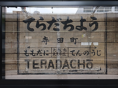 | 寺田町駅 旧駅名標 駅の改築中に壁の後ろから出てきました。欠損部分を修復して ホームに再び設置されました。 |
