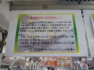 2013年4月28日、元西武701系の流鉄2000形なの花が引退することになった。これで、流鉄の車両は全車西武新101系の5000形に統一されることになり、西武顔と呼ばれる車両はこれで見納めになった。4月より、週末を中心にさよなら運転が行われてきたが、最終日の流山11時15分発からは、哀別のヘッドマークを掲出しての走行となった。