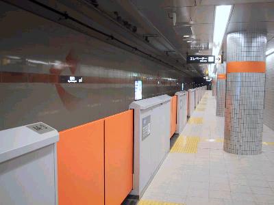 | ホームの様子。ステーションカラーのオレンジが鮮やかなホームドア | |