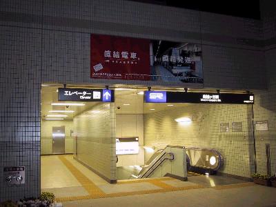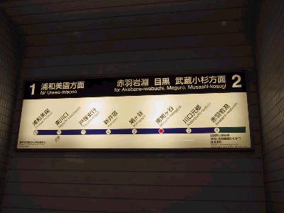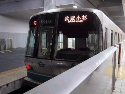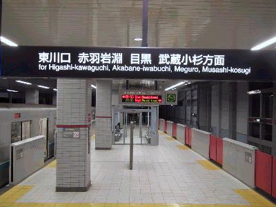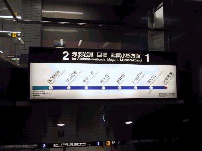 | ホームへ降りる階段の途中にある路線図 | ホームに停車中の営団9000系武蔵小杉行 反対側に見えるのはサッカーの試合が開催されるときに使用される 臨時ホームであろうか? |