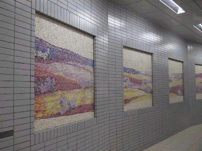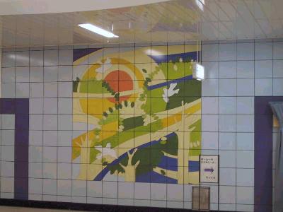 | 改札口正面の壁面のタイル | ホームへ向かう階段正面の路線図 |