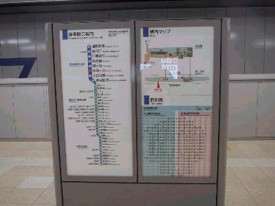 | ホーム先端部分 将来の8両編成対応用にホームが出来ている。 | ホームにある停車駅ご案内、構内マップ及び時刻表 |