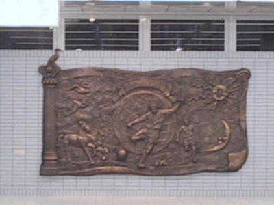 | 改札口正面にあるサッカーのレリーフ ワールドカップが行われる埼玉サッカースタジアム2002の最寄駅である。 |