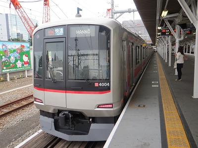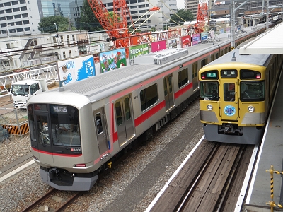 | 試運転中の東急5050系4000番台(4104F) かつて犬猿の仲だった西武と東急がこうして並ぶのを誰が 想像したでしょうか? 2012/08/18 所沢 |