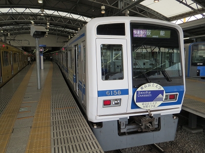 | 有楽町線・副都心線直通に使われることの多い東京富士大学の 広告車ですが、この日は地上運用の花形、快速急行の運用に ついていました。 2012/09/27 池袋 |