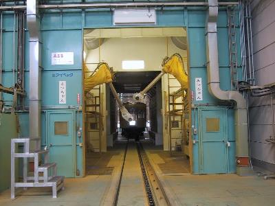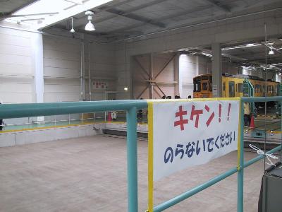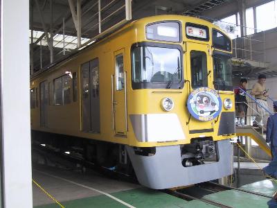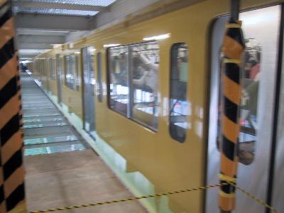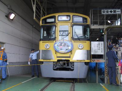 各駅停車。せめて、急行なら所沢まで急行運転なのに...と嘆くが致し方の無いところだ。のんびりとそして、たっぷり時間をかけながら飯能まで進んでゆく。途中の清瀬や所沢などでは、このヘッドマーク付き電車の写真を撮ろうと多くのファンがカメラを構えている姿も見てとれる。所沢まではそんなに混雑していなかったが、ここから、武蔵丘に行く乗客が急に増えて、立ち客も出るほどになる。本来この列車のの終点である飯能からもさらに乗客が乗ってくる。そして、いよいよ臨時として走る。隣の東飯能を通過して、車庫線へと入るのだが、所要時間は時間調整を含めて20分程かかるという。普段は乗ることのできない線だけに、やっぱりちょっとわくわくする。この列車、要所、要所ごとに、運転停車を行う。しかし、そのたびに車掌が的確に、「ここで何分停車します。」と案内があるので、思ったほどはイライラしない。昨年京急の久里浜工場に行ったときとは偉い違いだ。何回か停車したのち、車庫内の建物のホームに停車し、無事到着。ここでも、車両を限定して乗客を下すのだが、自分がたまたま早いところだったのかもしれないが、比較的スムーズに下りることができた。去年の京