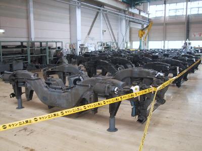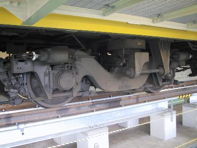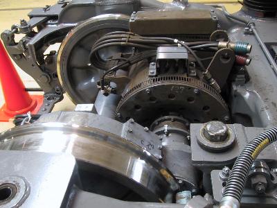 | 台車をこんな間近で見たことありますか? モータはこんな感じについているんですね。いわゆる並行カルダンですね。 |
