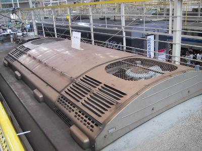 | 屋根上の見学です。こんな角度から電車を見る機会は滅多にありません。 | クーラーです。 |