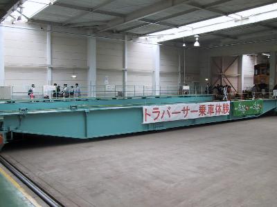 | これがトラバーサーです。この上の車両を載せて、運びます。 | 分かりにくいですが、現在、トラバーサー乗車中! |