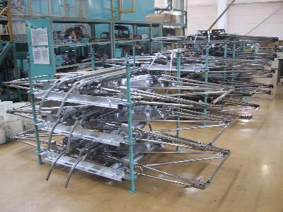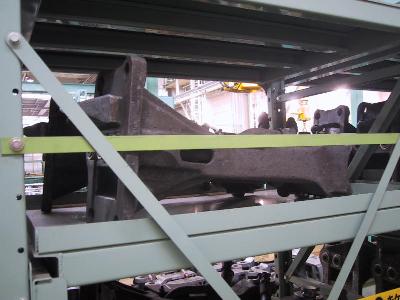 | 横から見てみます。大きなジャッキが車体を持ち上げます。 | 車体が上がって、台車が外れています。 |