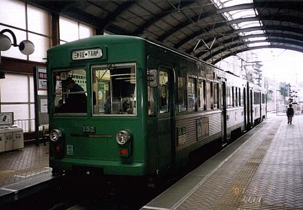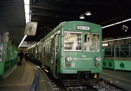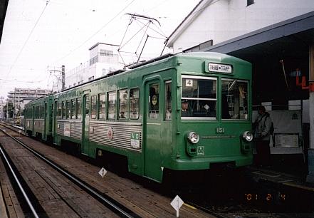 | 東急最後の釣り掛けモーターでのラストランは近い。 | 前日にさよなら運転をした154号。となりには300系赤が見える。上町にて |