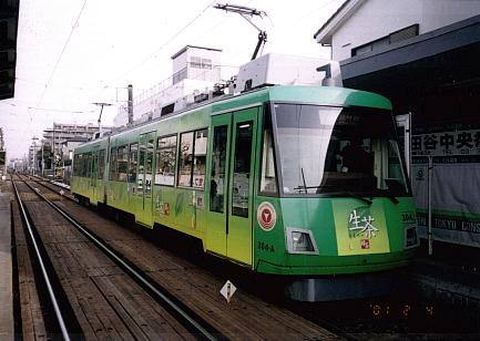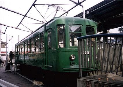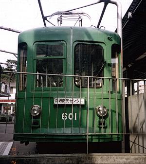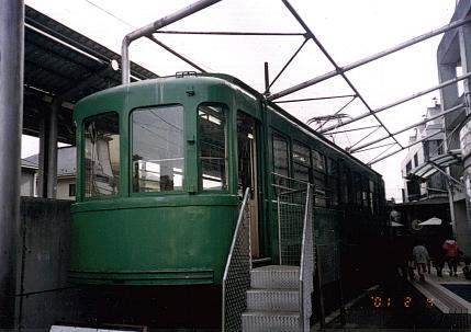 | 宮の坂駅に併設されている宮坂区民センターに保存されている、元江ノ電601号。 元を正せば、玉電の車両。今は故郷で安置され、隣に走る現役を眺めている。 今や東急グリーンはこれだけか?手前に写ってる駅への手すりがちょっと邪魔 してるのが残念。 |