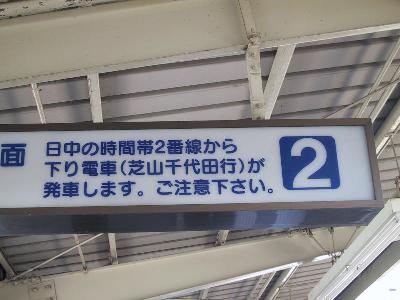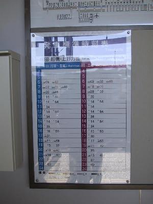 | 日中は上野方面行が発着する2番線から発車する。 | そしてこれが2番線からの時刻表。30分〜50分おきに発車する。 |
