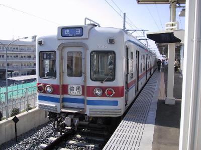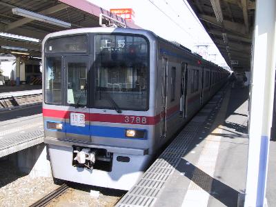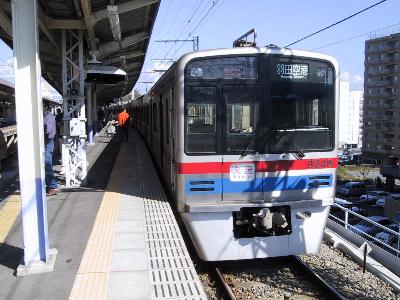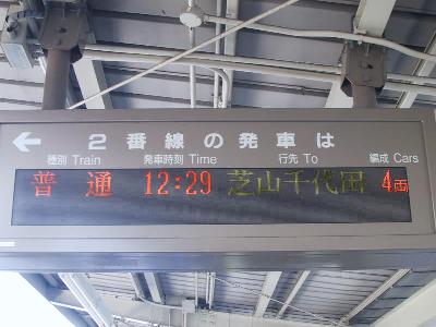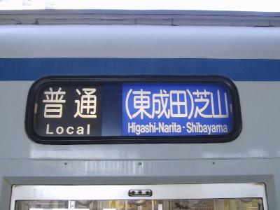 | 電車の到着です。車両は京成の3300系4両編成です。 | 行先は「芝山千代田」ではなく「(東成田)芝山」となっています。 |