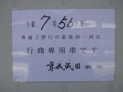 | 京成名物行商列車の案内です。 実は、この列車、芝山千代田発です。同じような案内が出てたのですが、 写真を撮り忘れました。(汗;) |