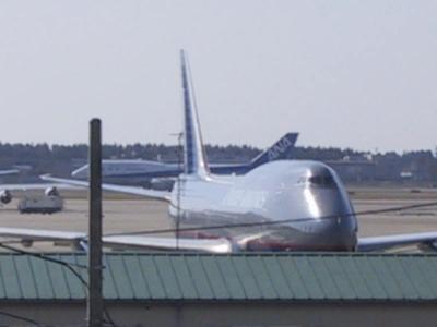 | ホームからこんな近くに飛行機が見えます。 手前はUNITED747−400、奥はANA747−400です。 |
