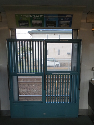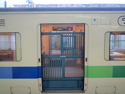 っぱなしで鉄格子のようなものがはめ込まれている。これで動くのだから、この車両だけ、戸閉連動を外してあるのか、はたまた非位置にしているのだろうか?ここまでやるのなら、ちゃんとドアは外して、もう少し見栄え良くするなどして欲しかったように思える。どちらにしても、中途半端な改造という感じは否めなかった。