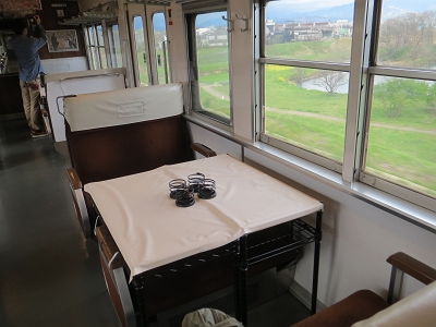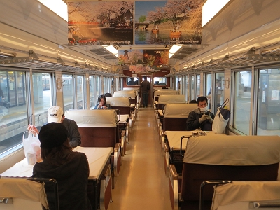 | 座席を潰して大きなテーブルにしています。 | この列車は稲沢貨物線を走行するのが目玉です。 |