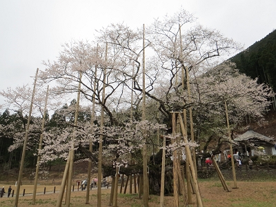 樽見駅から徒歩15分ほどで、根尾の薄墨桜に到着する。樹齢1200年で日本三大桜のうちの1つになっています。1200年とはすごいですね。いつ枯れてしまってもおかしくないのですが、付近の立ち入りを制限し、支柱を立て、なんとか延命の処置を施している甲斐もあり、今年も見事な花を咲かせた。