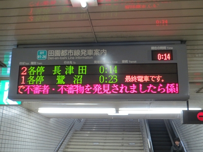 ここで、JRに見切りをつけ、小田急にすがりつく。最終の急行相模大野行で相模大野からは最終の新宿行に接続するようである。しかし、新宿に到着するのは午前1時過ぎ。ここから先の足がない。ということで、実家にピットインすることにした。相模大野から江ノ島線で中央林間へ。田園都市線最終の鷺沼行になんとか乗ることができた。最初から、ダイヤ乱れの覚悟はしていたのだが、まさか、こんなことになるとは・・・。まあ、とりあえず、帰ってこれたので良しということにしておこう。ちなみに、小田急線は振り替え輸送のため、ただ乗りでした。今度、お礼に、ロマンスカーで箱根にでも行ってこようかと・・・