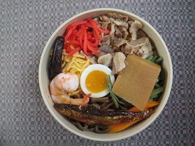 | プラスチックの容器に入っています。 | 中身は炊き込みご飯の上に信州の幸がふんだんにのっています。 |