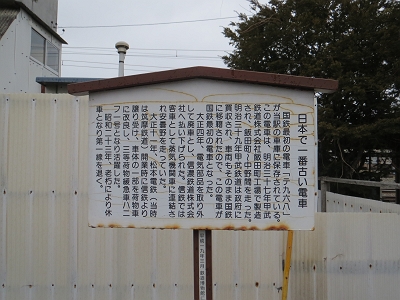 | 新村車庫には国鉄最初の電車ハニフが長らく保存されていましたが、 その貴重な車両から大宮の鉄道博物館に寄贈されました。 よくぞ、潰さずに残していたものです。 今、ここには看板だけがあります。 |