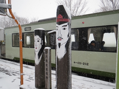 | 越後川口 駅名標 | 列車が埋もれる程の積雪です。 |