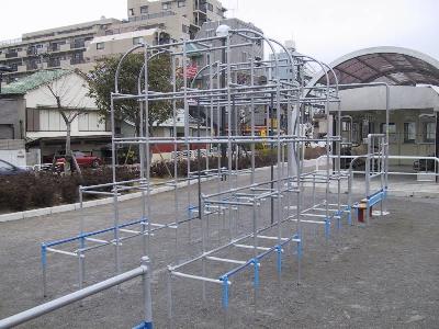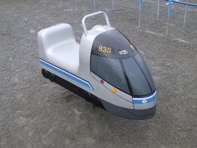 | これがジャングルジム本体です。側面にちゃんとブルーのラインがあります。 | 新05系の遊具もあります。これは2台設置されています。 こんなものにも行先はもちろんのこと車番と運行番号まで 描かれています。しかもちゃんと営団車を示す「S」の表示。 |